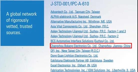 2021年1月5日,位于常州市的電子制造服務商常州博康電子技術有限公司經過近半年的工藝制程優(yōu)化,依照IPC J-STD-001《焊接的電氣與電子組件要求》與IPC-A-610《電子組件的可接受性》對工藝制程和產品的要求,順利通過IPC QML認證,而榮列IPC全球可信資源庫。